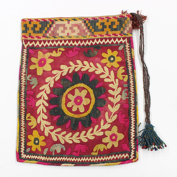 茶葉や煙草葉収納袋(チャイ・カルタ) ウズベキスタン <ウズベク> 木綿、絹刺繍、タッセル(房飾り)