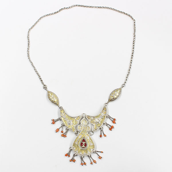 首飾り 中央アジアまたは西アジア 銀に金めっき、銀、色紙の上に板ガラス、サンゴ